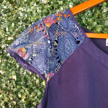 BLUSA AZUL MARINHO COM RENDA BORDADA NA MANGA FEMININA TAM P - CZK