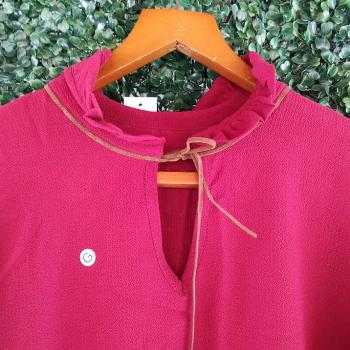 BLUSA POLIESTER - MANGA BUF - BABADINHO NO PESCOÇO - FITA MARROM EM CARMURÇA