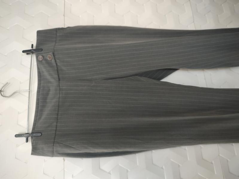 Calça social feminina tamanho 40, risca de giz cinza escuro, 70% poliéster, 27% viscose e 3% elastano.