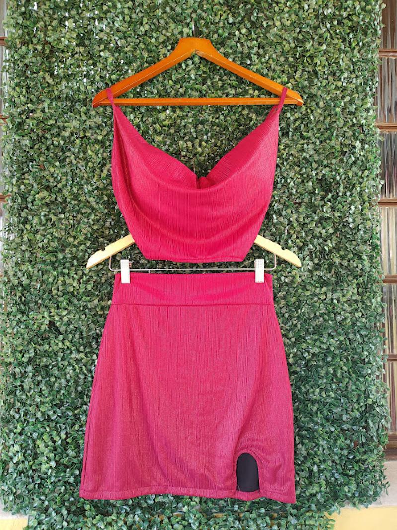 CONJUNTO SAIA E TOP VERMELHO BRILHOSO COM FORRO PRETO E BOJO - NAELY
