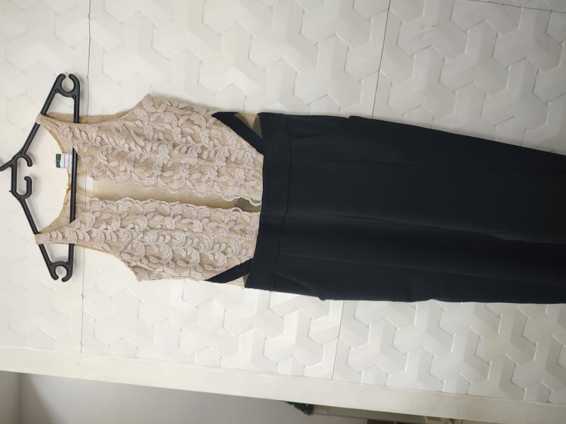 Macacao feminino bege com renda e preto, tamanho P, 100% poliester e tule 100% poliamida.