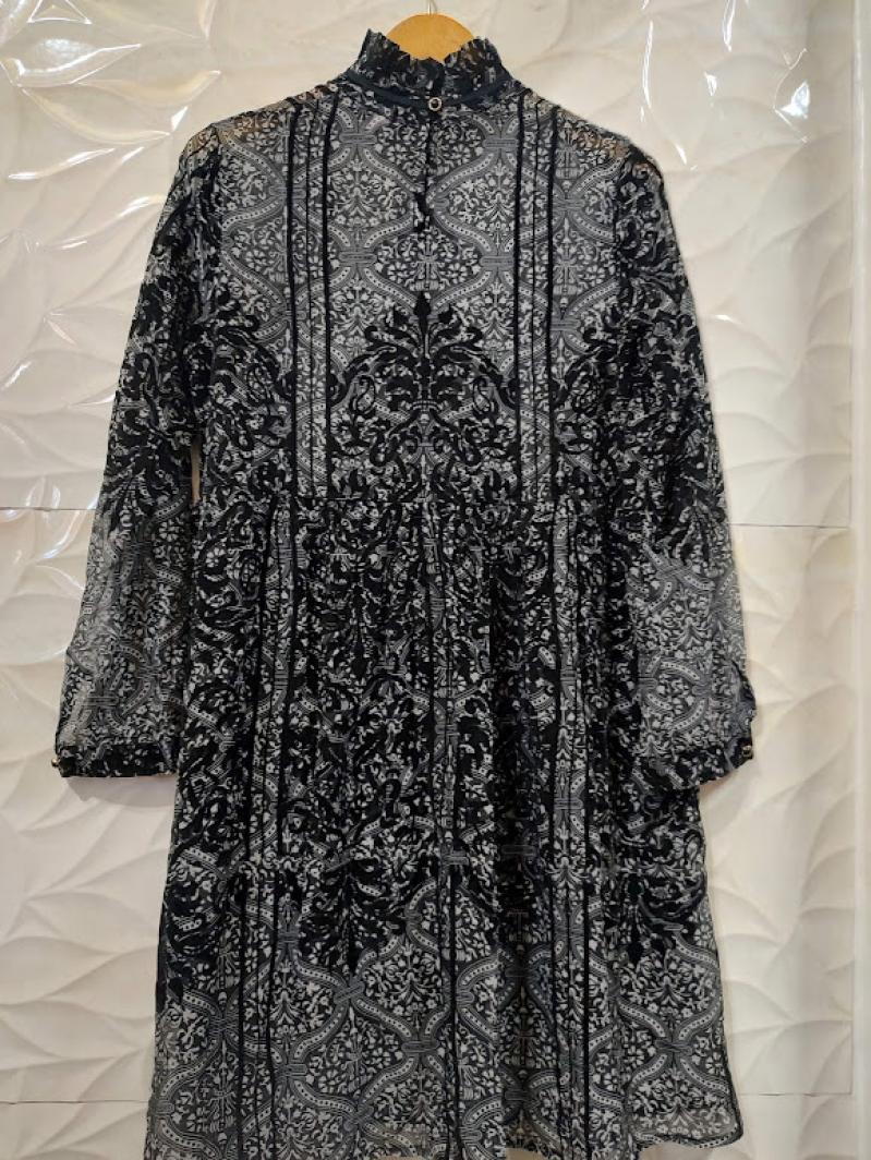 É vestido curto com mangas longas é uma peça sofisticada e ousada, caracterizada pela combinação elegante de cores contrastantes e pela transparência sutil do tecido. A transparência do tecido adiciona um toque sensual ao vestido, revelando delicadamente a pele sem ser excessivamente revelador.